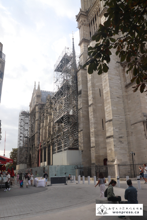 巴黎圣母院的广场给我的第一印象有些出乎意料。印象中,这里应该是一片开阔的广场,可以容纳络绎不绝的游客。但如今再到现场,却觉得场地并不大。后来才意识到,这可能是因为部分区域仍在修复,脚手架占去了不少空间,削弱了昔日的辽阔感。2019年的大火让巴黎圣母院损失惨重,虽说修复工作已经持续多年,但仍未完全恢复原貌。