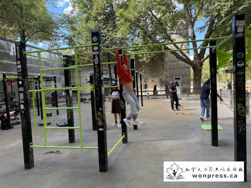 这公园并非寻常街角小园,而是极具规模。最令人意外的,是公园一隅竟安置着一个长途汽车站,就设在塞纳河旁。汽车站前的空地并未荒置,而是被打造成一个小型的健身场地。更有趣的是,那里聚集的并非随意玩耍的游客,而是一群姿势标准、动作熟练的健身爱好者,他们举手投足之间透出专业的气质,让人忍不住驻足多看几眼。