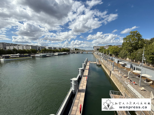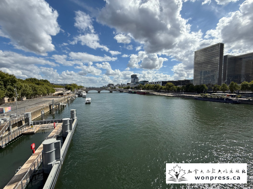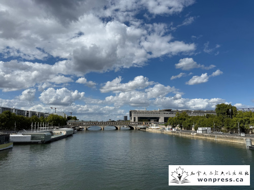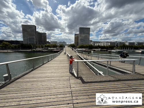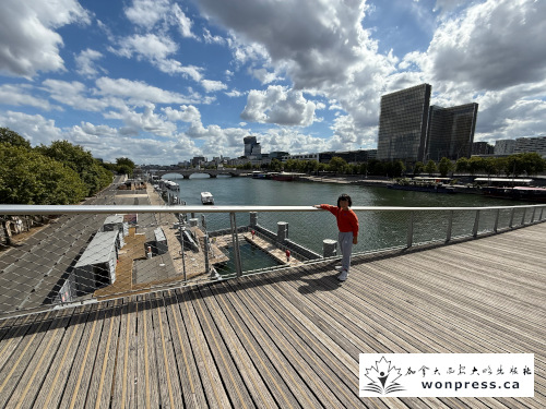 顺着公园小径前行,不久便遇到一段长长的石梯。拾级而上,脚步随着阶梯的延展逐渐加重,呼吸中夹杂着汗水与期待。待到登顶,豁然开朗,塞纳河大桥赫然在前。桥身宽阔而现代,宛如一道笔直的通道,将视野引向河对岸的广场。再远处,那一幢幢方正对称、如同摊开的书卷般的建筑物映入眼帘——正是新建的法国国家图书馆。