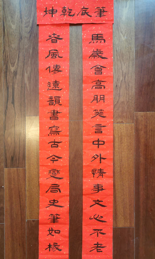 思想的交流离不开艺术的助兴。为了庆贺俞明德先生的新作问世,并致敬其老而弥坚的创作精神,庞进特意书写对联一副相赠。上联为“马岁会高朋,笑言中外情事,文心不老”,下联为“春风传远韵,书写古今变局,史笔如椽”,横批为“笔底乾坤”。这副对联不仅巧妙地契合了马年新春的时令与聚会之乐,更精准地概括了俞明德先生乃至在场所有华文写作者以笔为桨、遨游于古今中外、以文字描绘乾坤的执着追求。