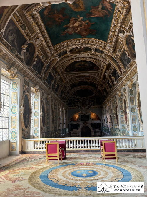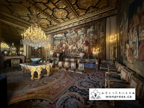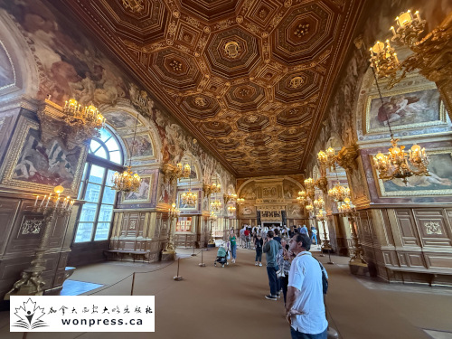 丛医生多次来访,对宫殿的线路、展品都较为熟悉,因此他在外面等候,让我们随人流进入室内参观。我承认,第一次面对那些金碧辉煌的大厅、巨幅油画、精雕细刻的木饰与挂毯时,更多的感受是“震撼”而非“消化”。枫丹白露宫并非单一朝代的作品,而是从中世纪狩猎小屋演变为经历文艺复兴、巴洛克至帝国风格叠加的大型宫殿,它曾长期作为法兰西君主的居所,直到19世纪其作为王室住所的重要性才有所减弱。作为一个“长期居住”的王宫,枫丹白露的构成包含了大量历史层面上的增建与改造——从弗朗索瓦一世(Francis I)的文艺复兴式添加,到路易十四时期的大型庭园规划,再到拿破仑时代的私人寝宫与帝国风格调整,宫殿的每一层装饰都在讲述一个时代的偏好与统治者的私趣。