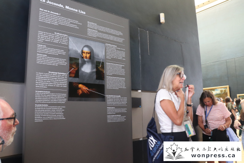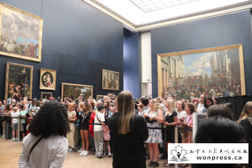 进入卢浮宫后,第一站几乎所有人都会期待的,便是达·芬奇的《蒙娜丽莎的微笑》。人群果然如潮水般拥挤,所有人的注意力都被那幅尺寸并不大的画作所吸引。远远望去,她的眼神仿佛会随人移动,那抹似有若无的微笑更是让人琢磨不透。Susan提醒我们,作品背后隐藏着关于神秘模特身份的争论,至今仍众说纷纭。与她相对的墙上,则悬挂着意大利文艺复兴时期另一幅巨制,让观赏者能体会到艺术张力的对比。
