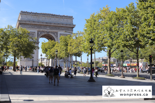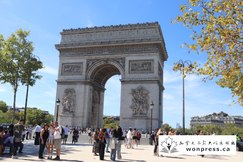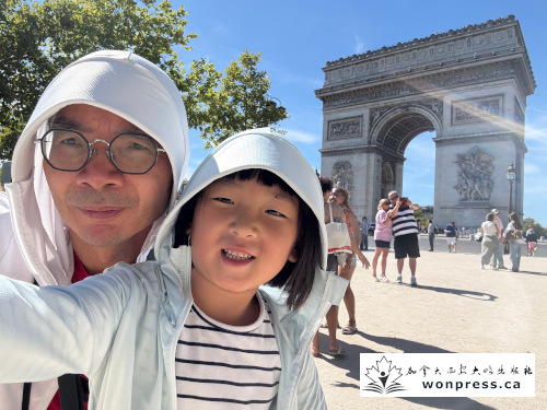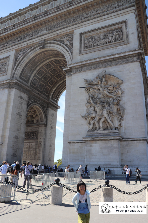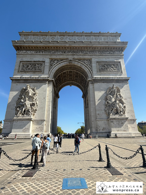 用餐之后,我们斜插过去,很快便抵达了矗立在香榭丽舍大街尽头的凯旋门。它巍然耸立,气势恢宏,始建于拿破仑时期,用以纪念大军的胜利。高近五十米的门体上雕刻着大量浮雕,表现着法国历史上重要的战役与场景,门下的无名烈士墓自1923年以来长明不灭的火焰,为这座宏伟的建筑增添了庄重肃穆的气息。多年以前我曾来过巴黎,对凯旋门依稀留有印象,却已记不清当时是步行还是乘车经过,如今回到此地,依然让人心生震撼。我建议登顶凯旋门俯瞰香榭丽舍大街的壮丽全景,但女儿婉拒,只愿在阴凉处歇息片刻,静静环顾这片广场。旅行不必处处追求完整,有时留白本身就是另一种美。