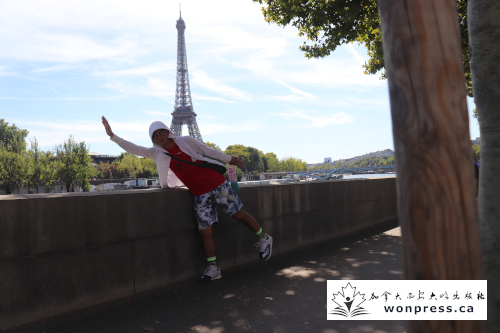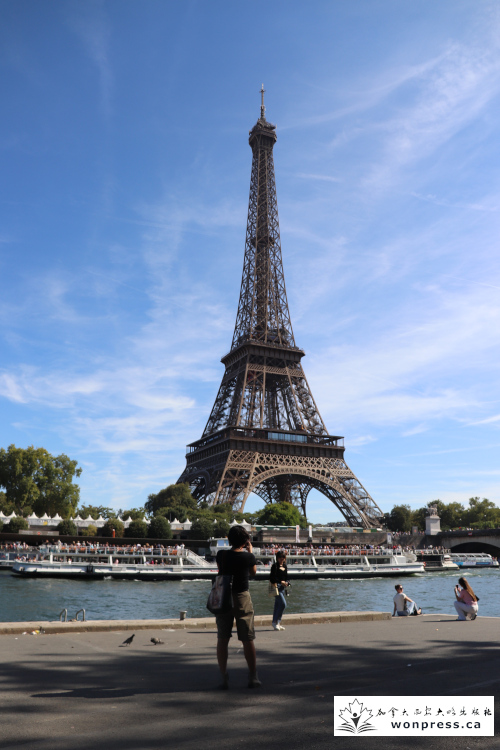 在靠近铁塔正面不远处,我们找了一个下行的台阶,走到塞纳河的河沿上。这里的视角更低,铁塔仿佛更加高耸入云。正当我们四处张望时,遇到几个在此玩耍的印度学生。他们看到女儿手里拿着相机,立刻笑着跑过来,摆出各种姿势,让她当起了临时摄影师。他们比划着希望以铁塔为背景留念,青春的活力和热情溢于言表。女儿也乐在其中,举着相机咔嚓连拍,一阵欢笑声在河岸边回荡。这一意外的小插曲,让原本单纯的观光多了一份人情味与温暖。